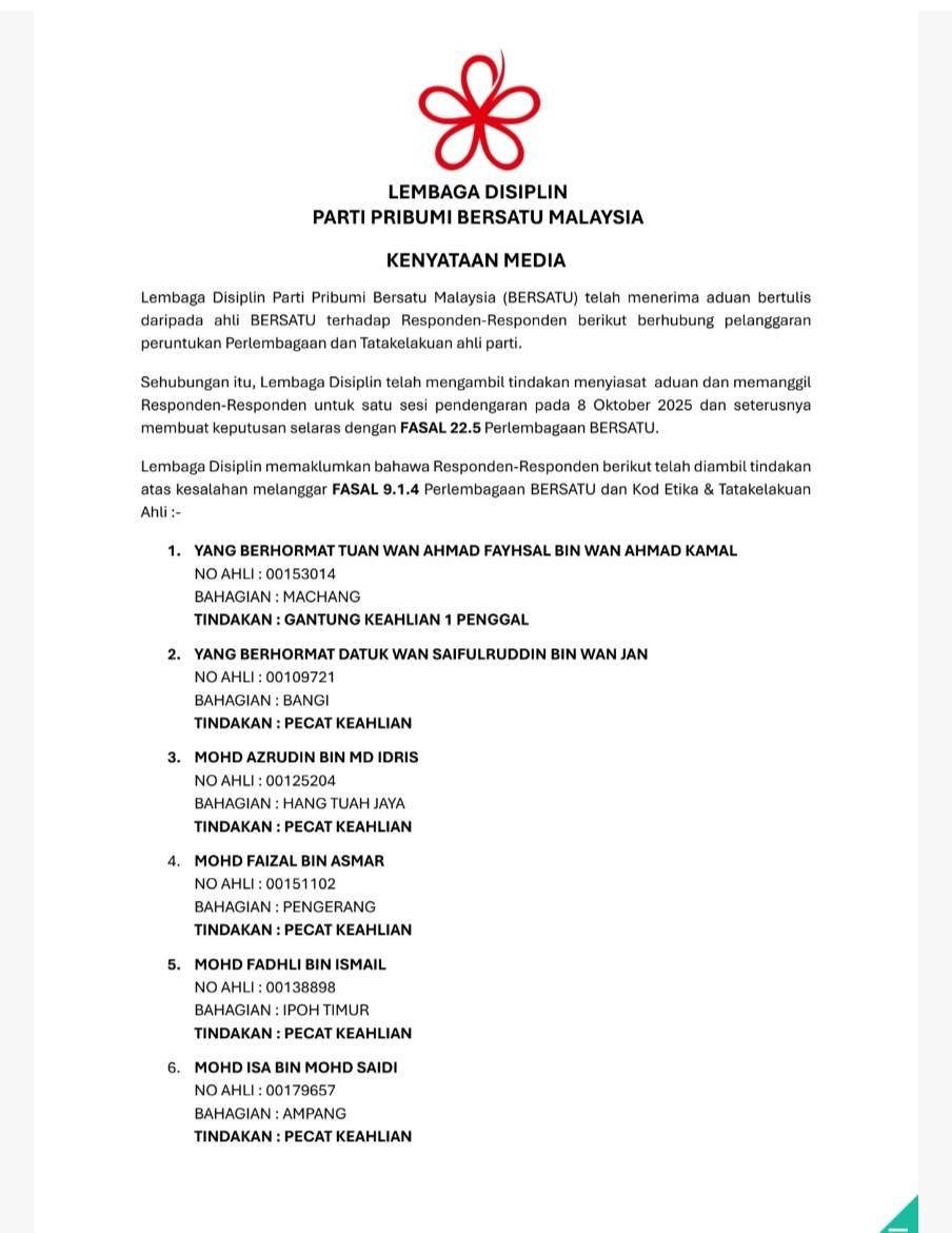 除了两人之外,另有4名区部主席被开除,他们分别是汉都亚再也区部主席阿兹鲁丁(Mohd Azrudin Md Idris)、边佳兰区部主席法依沙阿斯玛(Mohd Faizal Asmar)、怡保东区区部主席法德里依斯迈(Mohd Fahdli Ismail),以及安邦区部主席依沙赛丁(Mohd Isa Mohd Saidi)。