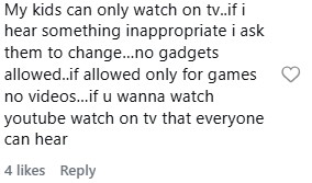 “我的孩子只能看电视,如果我听到不合适的内容,我会让他们换台。不准带任何电子设备,如果有,也只能玩游戏,不能看视频,如果想看YouTube,请在电视上看。”