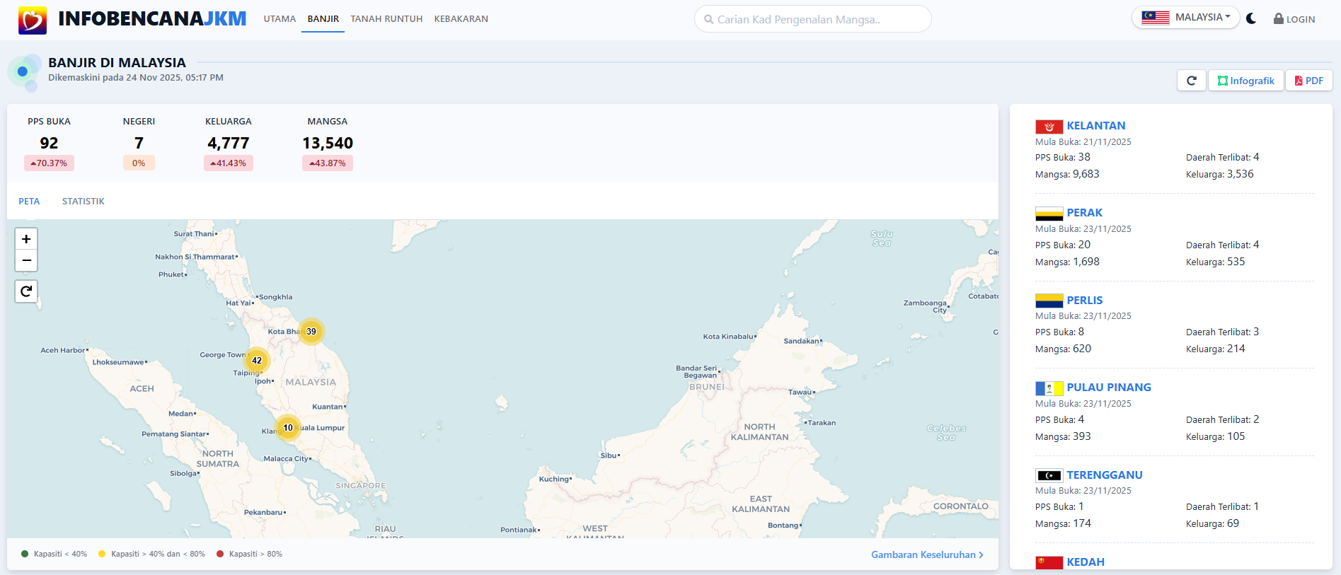 根据社会福利局的数据,截至截稿前,水灾灾民人数已经攀升至13,540人;涉及7个州属、4,777户家庭受影响。目前已开放92间临时疏散中心。