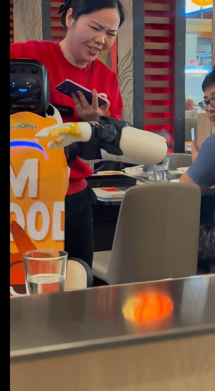 岂料,歌曲播完了后,机器人突然一个箭步到前方的桌子前,双手向内弯曲开始往桌上拍,导致桌上的筷子被拍飞,疑似食物的酱料也随之往外溅,食客见状纷纷发出惊呼。