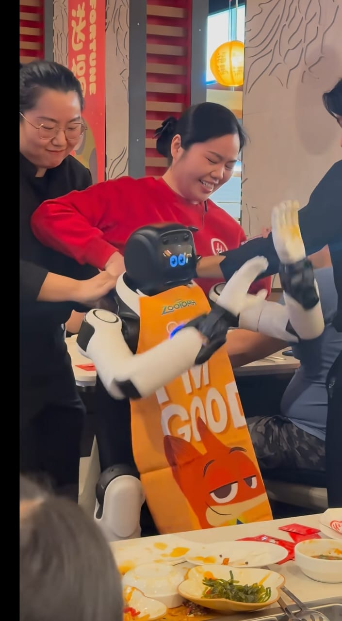 看着几位一脸无奈的服务员,以及沉浸在自己世界,试图继续为食客跳舞的机器人,现场的食客也啼笑皆非,一些人忍不住发出阵阵笑声。