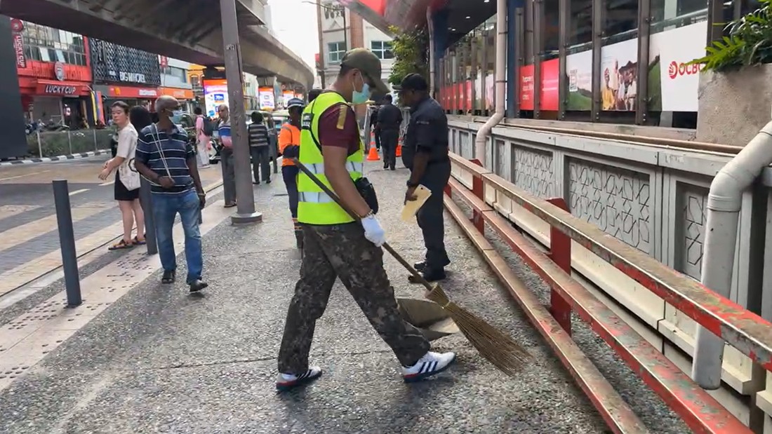 至于彭亨淡马鲁方面,昨天(2月12日)被法庭裁定执行社区服务令的2名垃圾虫,今早也穿上印有“社区服务令”字眼的背心,在淡马鲁鲁拉士曼丹大街展开“扫街”任务。