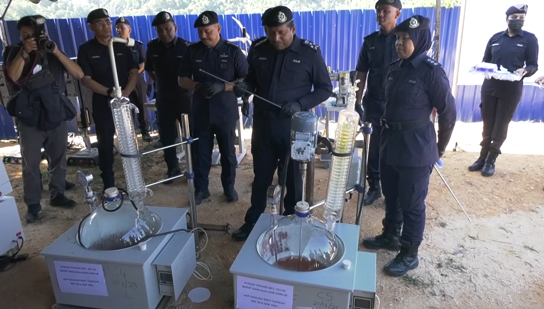 榴梿园竟藏炼毒厂?警方近日捣毁一个隐藏在槟城直落巴巷(Teluk Bahang)的榴梿园的炼毒厂,并起获市值约3800万令吉的毒品!