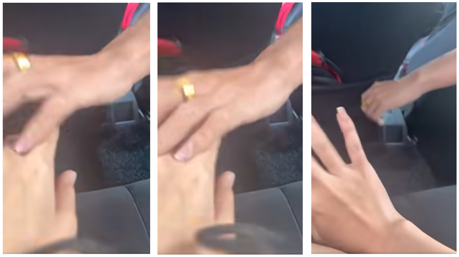女乘客则多次挥手挡下男司机的手,随后还紧紧地握拳,抓住盖在腿上的外套,明显感受到当事人情绪紧绷。