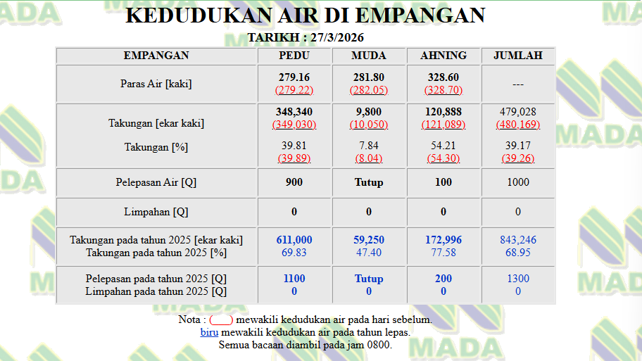 根据慕达农业发展局(MADA)官网的数据显示,慕达水坝(Empangan Muda)水位已下降至7.84%;柏鲁水坝为39.81%,安宁水坝(Empangan Ahning)则为54.21%,整体蓄水量约为39.17%。