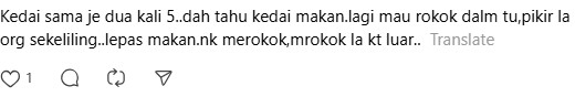 “明知道是餐厅,还要在里面吸烟。拜托为周围的人考虑一下,如果吃完饭想吸烟,可以到店外。”
