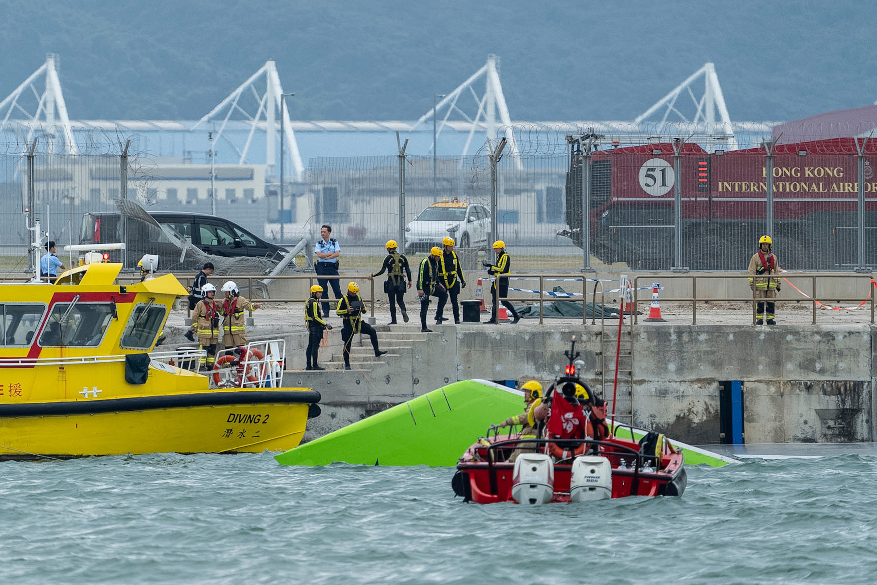 一辆地勤车辆在事发时被货机撞中后坠海,车上两人受困。消防潜水员先后救起两名男子,其中一名约40岁地勤车司机在送往北大屿山医院抢救后不治;另一名约30岁男乘客被证实当场死亡。