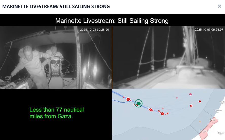 据报道,昨晚(10月2日)这艘未被拦截,并且仍在航行的玛里内特号(Marinette)仅距离加沙约 80 海里,距离以色列拦截同一船队中其他船只的地点约10海里。