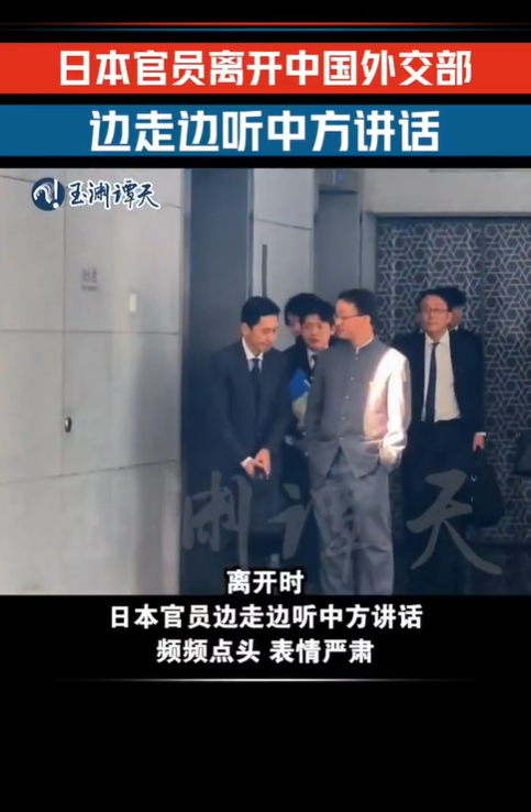 央视旗下的新媒体“玉渊谭天”发布双方的照片及视频,并配文形容画面“离开时,日本官员边走边听中方讲话,频频点头,表情严肃。”