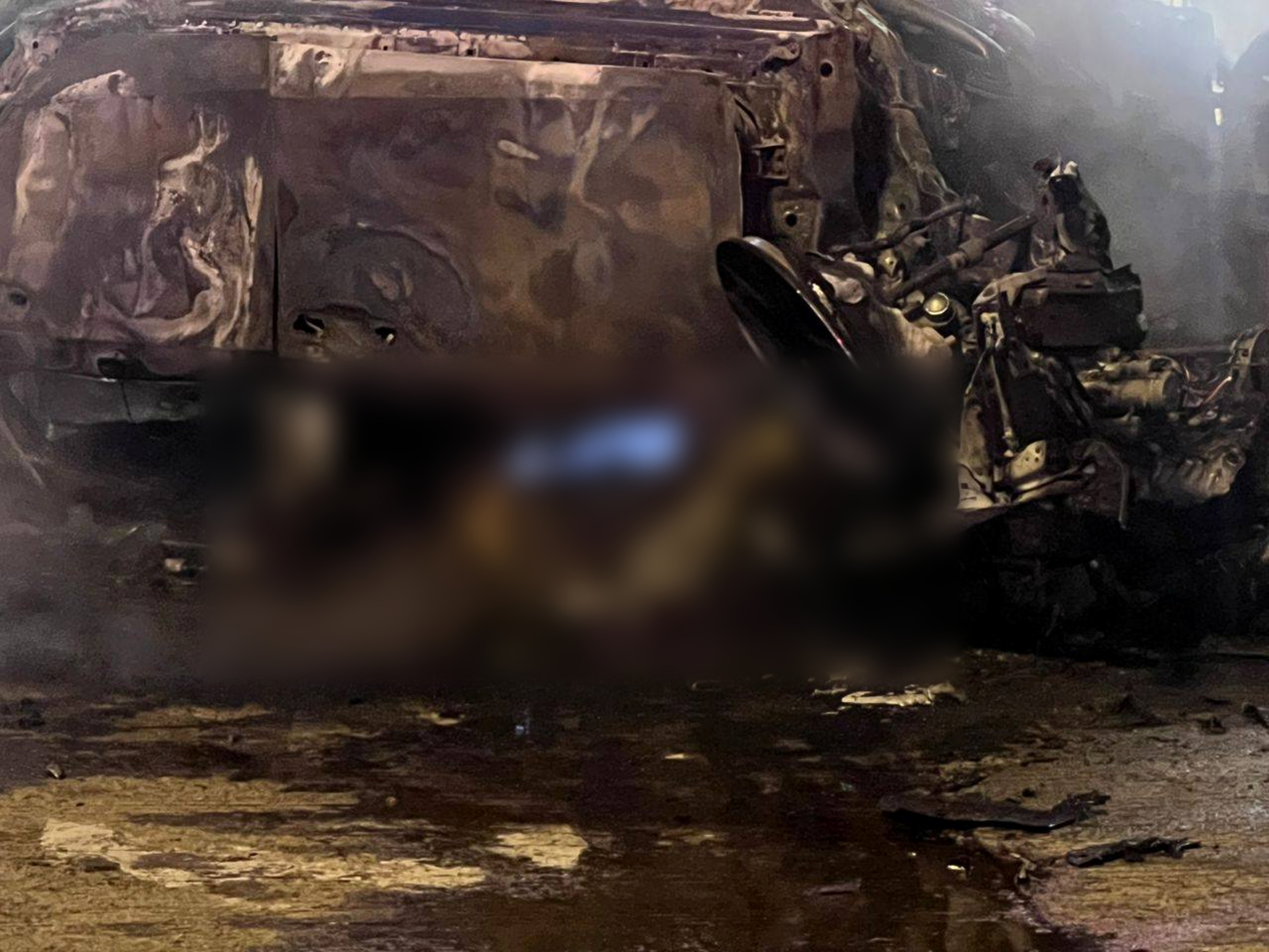 他透露,初步估计车辆损毁约85%。火势扑灭后,经检查发现,车内有两具焦尸。