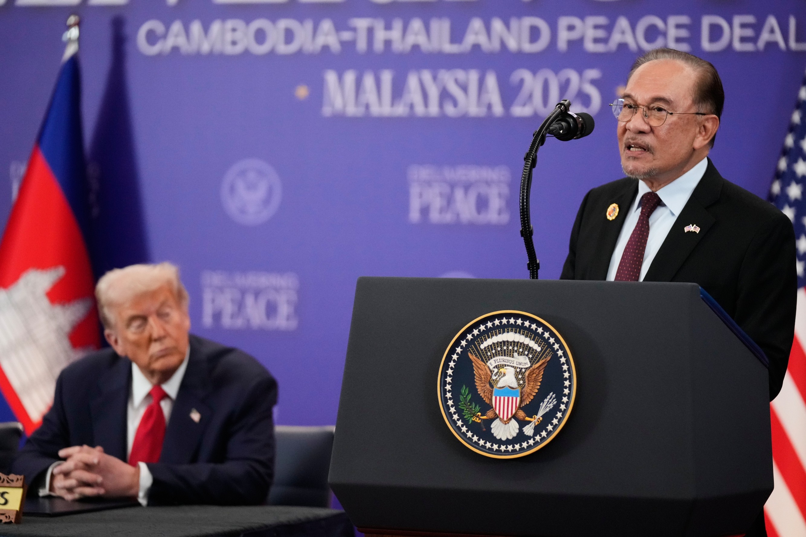 安华在泰国首相阿努廷与柬埔寨首相洪马内签署《吉隆坡和平协议》致辞时表示,马来西亚钦佩特朗普的坚毅与勇气,并指出世界需要有信念推动和平的领导者。