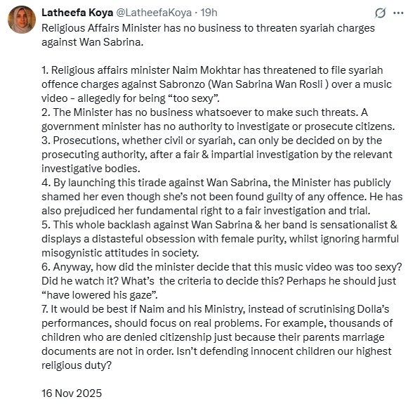 也是律师的拉蒂花昨天(11月16日)在社交平台“X”上指出,无论是民事诉讼或伊斯兰法诉讼,都只能在调查机构进行公正的调查后,由检控方决定是否提控。