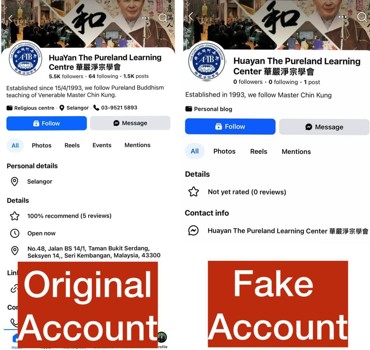 仔细一看可发现,华严净宗学会真正的脸书专页为“HuaYan The Pureland Learning Center华严净宗学会”,其中“Y”为大写字母,与网传截图中的小写“y”有所不同。