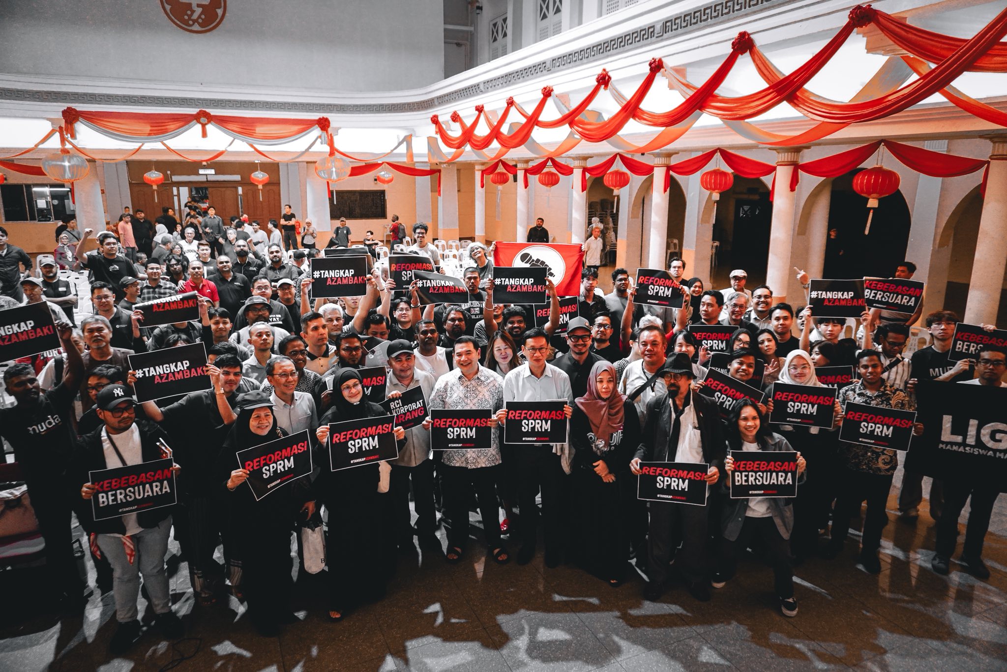 公正党旺沙玛珠国会议员扎希哈山(前排左5)昨天出席隆雪华堂举行的“逮捕阿占巴基”(Tangkap Azam Baki)巡回讲座会终场。(图取自Mandiri - Pusat Pembangunan Rakyat面子书)