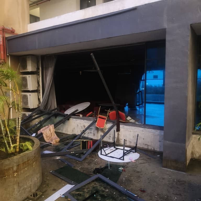 同时,位于海滨路的餐馆因经不起强风,玻璃窗被吹裂,大门被撞开,餐厅内的桌椅翻倒散落,现场凌乱不堪。