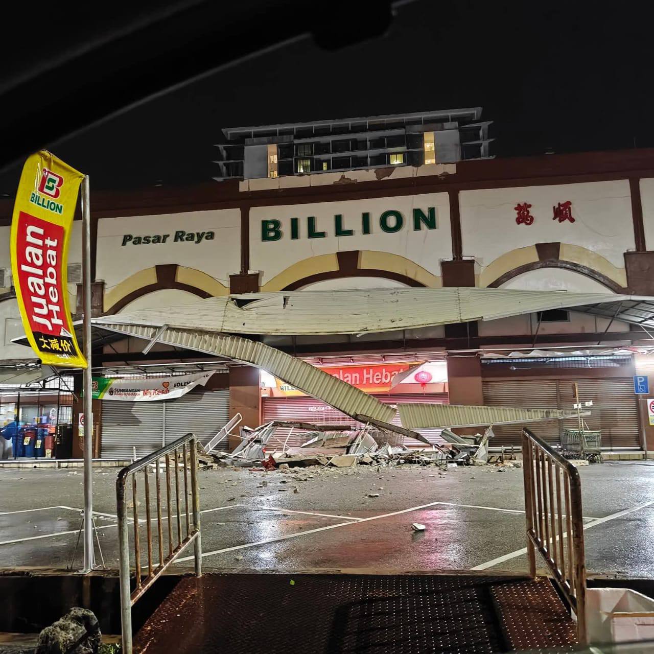 从网民在面子书分享的照片可见,万顺购物中心的遮阳棚纷纷被吹倒,瓦片碎片散落满地,所幸并未有传出伤亡消息。