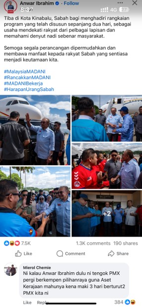 而在滥用政府资源的例子中,首相安华飞往沙巴助选的举动也被质疑涉嫌动用政府资源为首相行程买单。