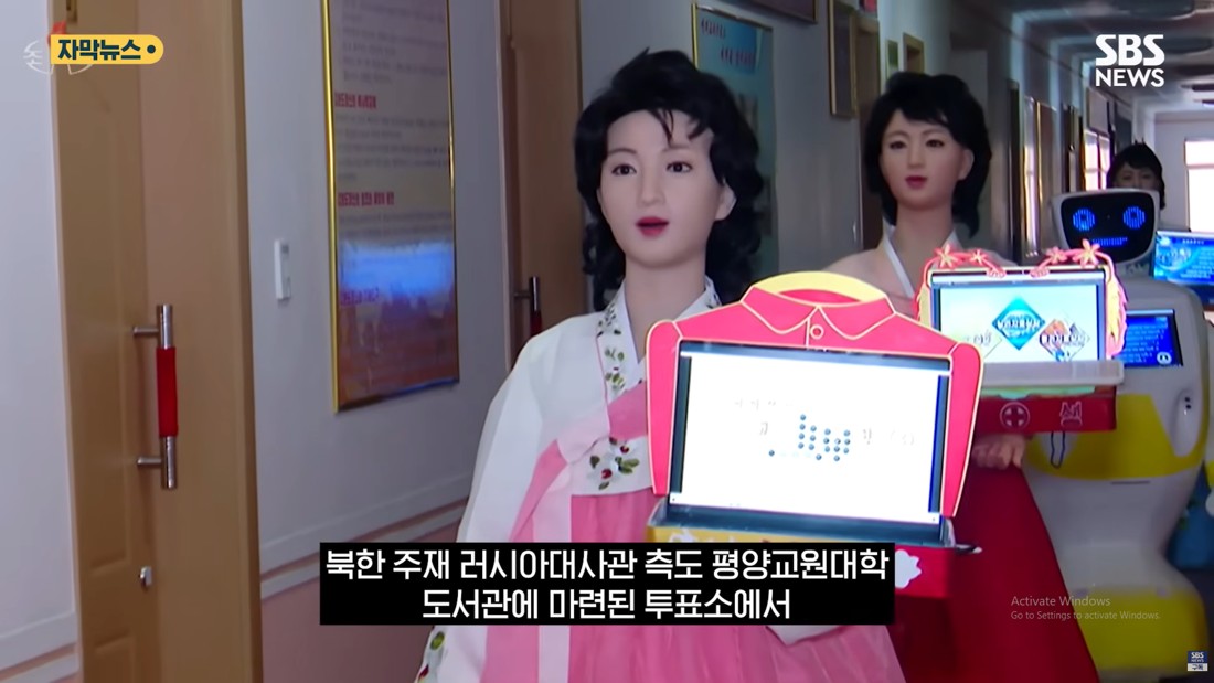 “一名身穿朝鲜传统白色韩服上衣和蓝色裙子、形似少女的机器人,在平壤师范大学图书馆内的投票站内接待选民,并指导选民完成投票程序。”