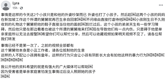 帖文指出,视频中的两名男童为亲兄弟,其母亲长期在新加坡工作,平日将孩子托付给父母照顾,而影片中施暴的男子则是两名男童的舅舅。