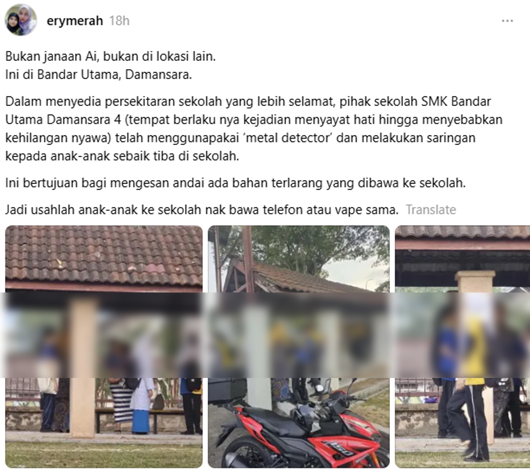 该网民还在贴文中表示,校方这么做的目的,是为了检查是否有学生携带任何违禁物品进入校园。