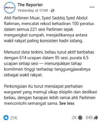 根据网媒《The Reporter》引述的最新数据,赛沙迪自宣誓就任以来,出席了所有 221 场国会会议,创下百分百全勤纪录,被视为国会出席率最稳定的人民代议士之一。
