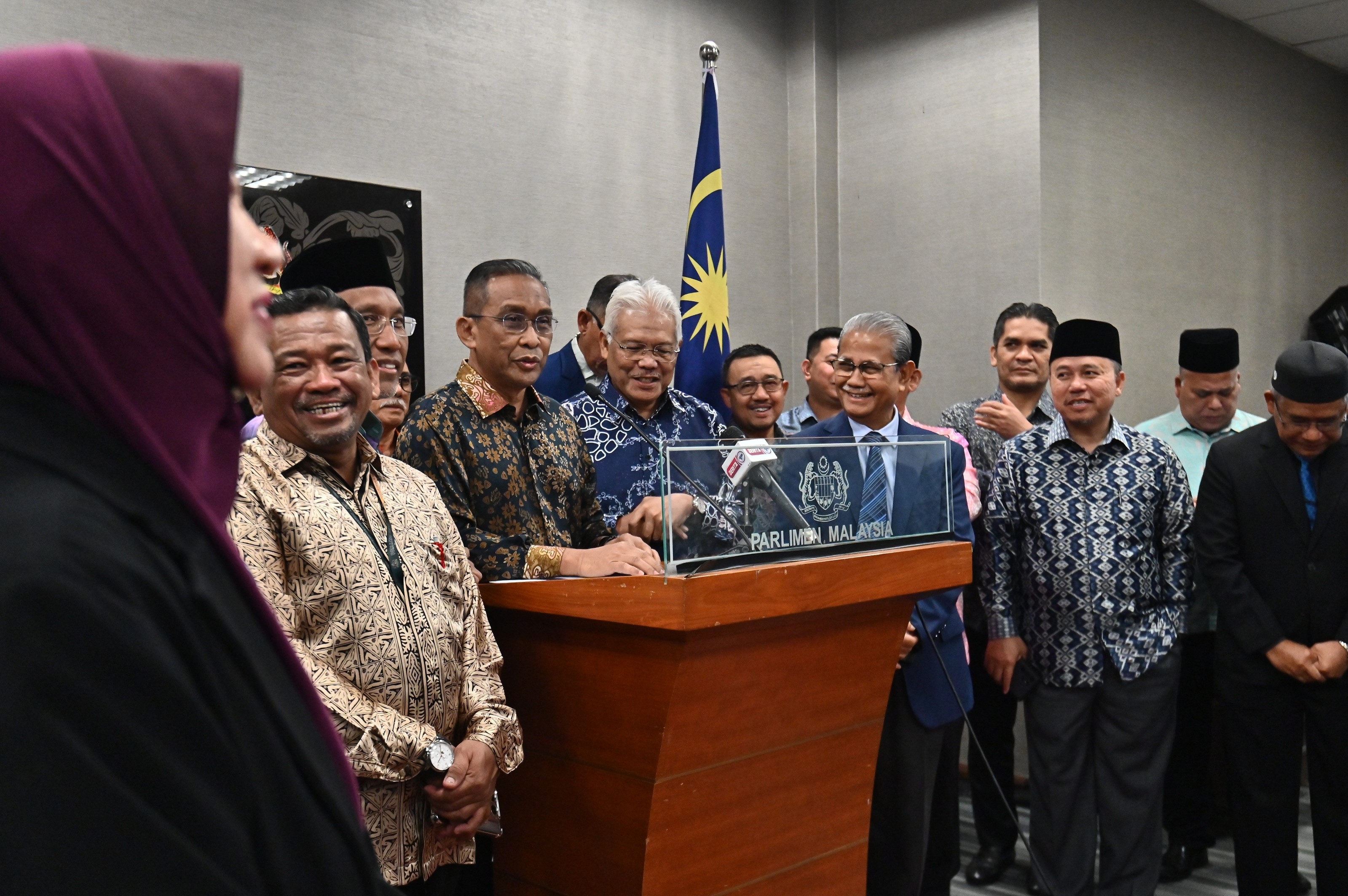 达基尤丁(左4)今天连同国会反对党领袖韩查再努丁(左5)等人,在国会媒体室召开记者会。(图取自马来西亚新闻局)