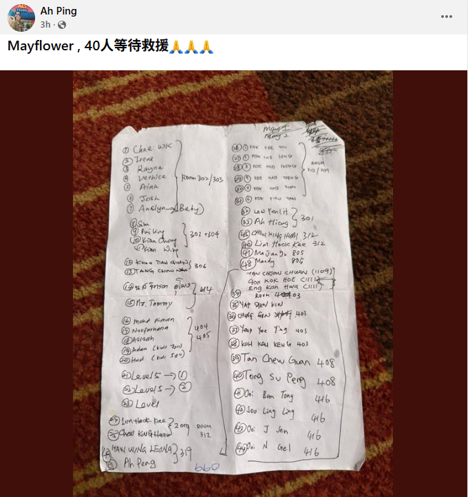 受困在酒店的大马人纷纷在社交媒体上求救,有人将红色环保袋、衣服挂在窗外当求救标记,希望能引起救援人员的注意。