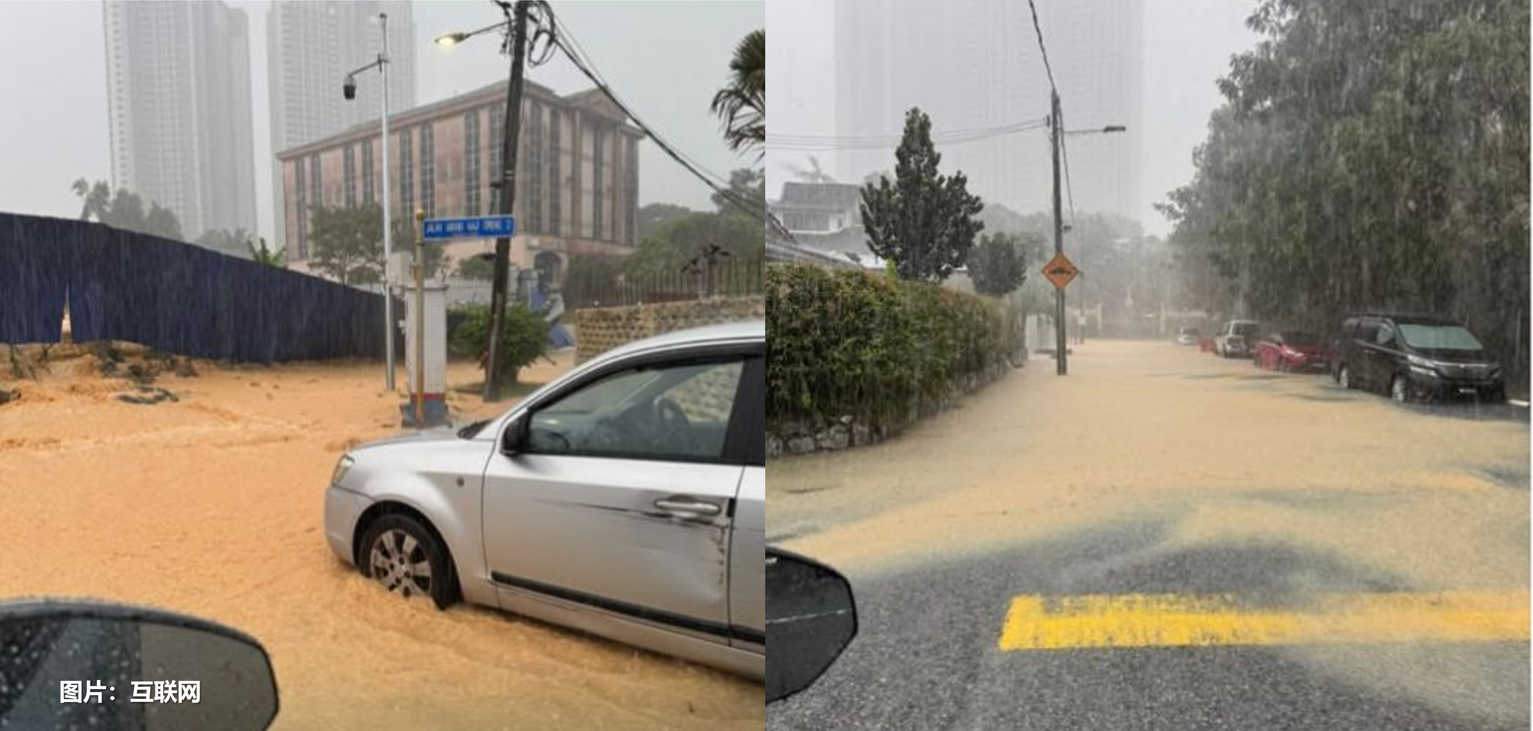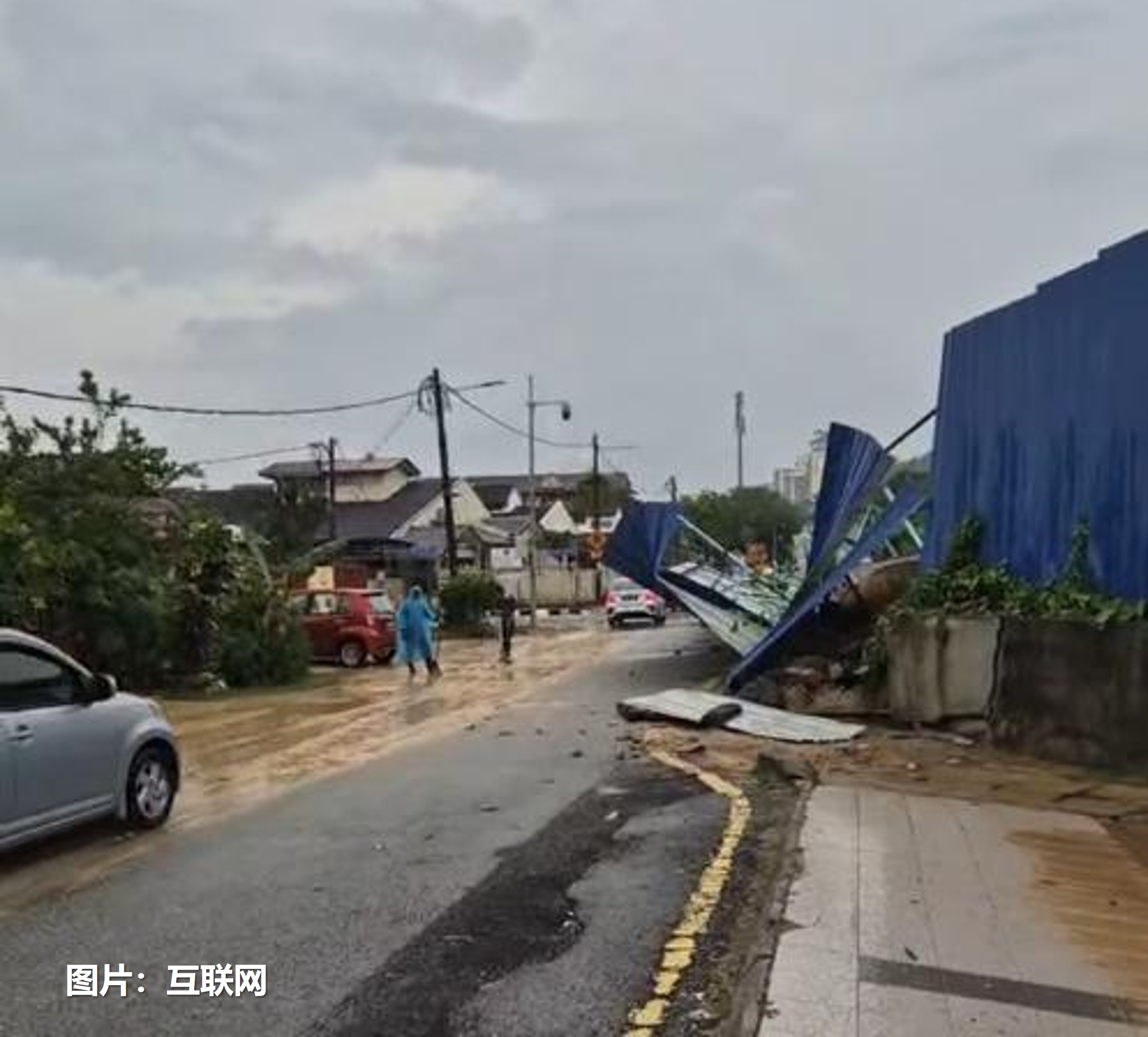 网传画面显示,事发时雨水夹杂泥流涌入道路,导致位于敦依斯迈医生花园的阿邦哈芝奥本路(Jalan Abang Haji Openg) 被泥水淹没,车辆只能缓慢通行。与此同时,强风也把工地的铝制围墙吹得东倒西歪,雨后现场一片狼藉。