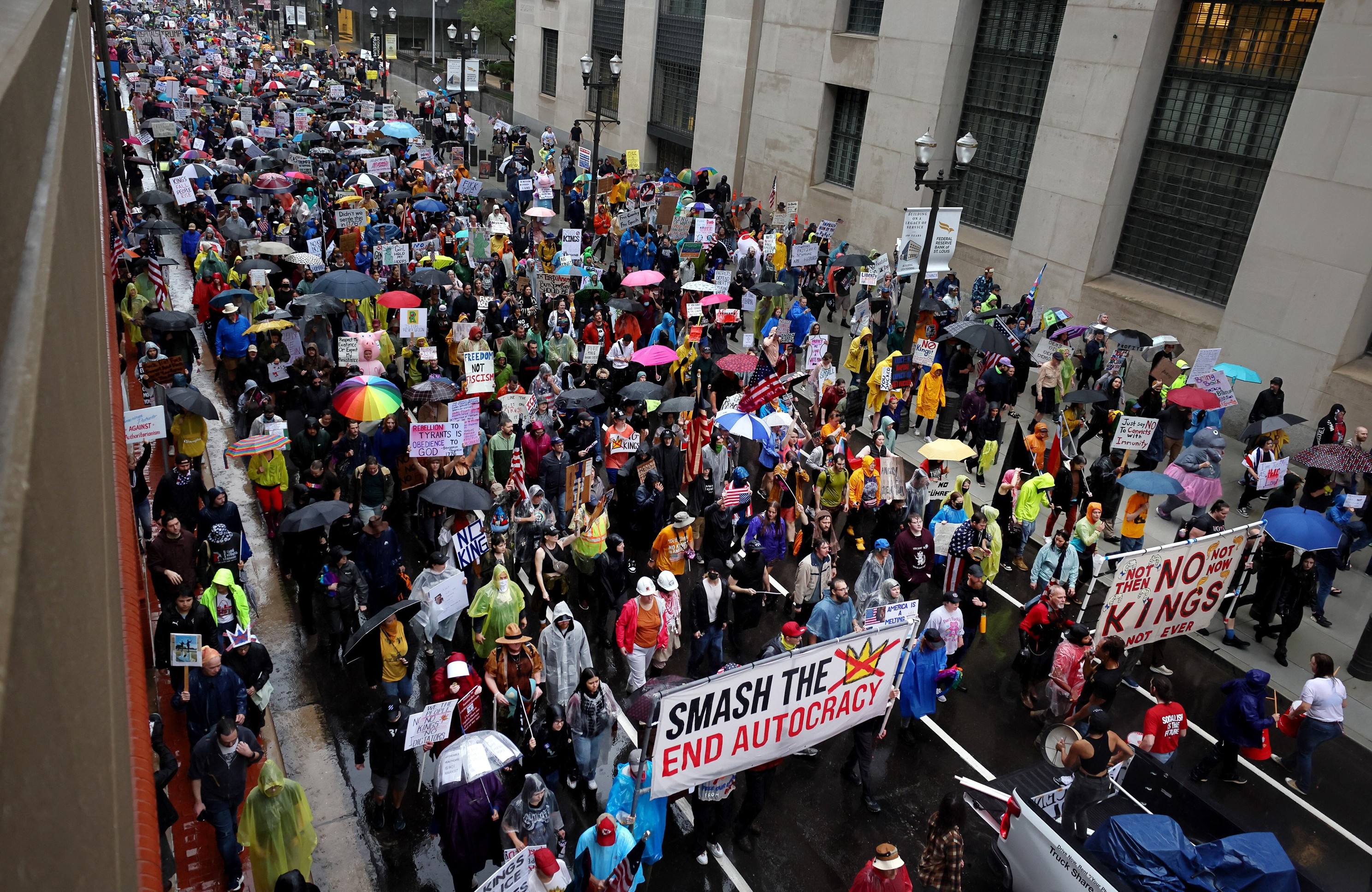 抗议者高举“捍卫民主”、“美国没有国王”、“特朗普必须下台”等标语,游行气氛热烈。