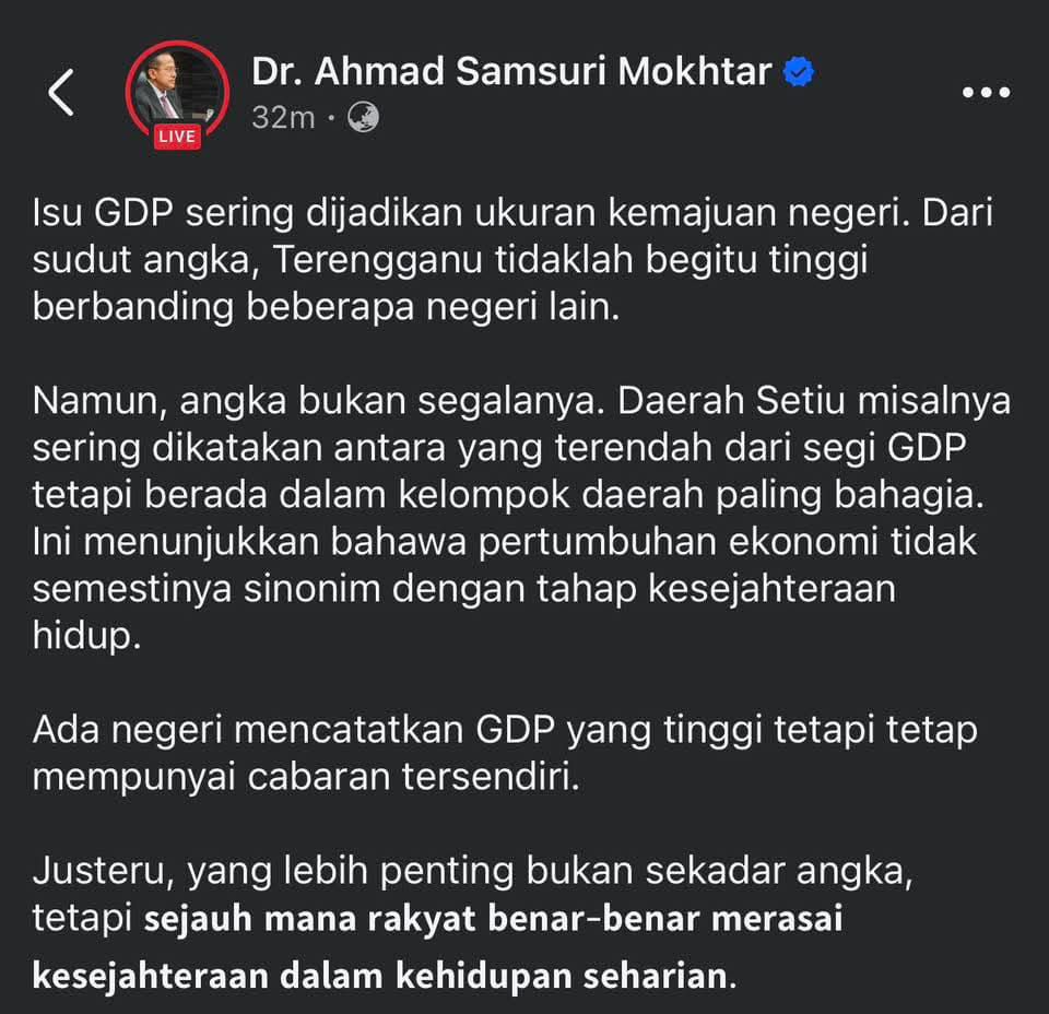 “像是士兆(Setiu)来说,经常被视为GDP最低的地区之一,但却被认为是‘最幸福的县属’。这显示了经济成长未必要和人民的生活福祉挂钩。”