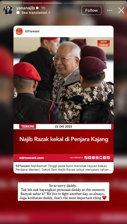 纳吉女儿诺雅娜(Nooryana Najwa Najib)也在社交媒体“Instagram”上发布限时动态,对判决结果感到失望。