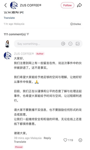 ZUS COFFEE今天发表三语声明指出,他们已经在密切关注以及处理此事。