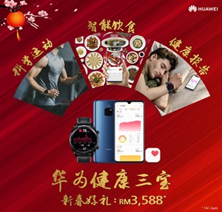 这“健康三宝” 原价分别为 Mate 20 RM 2,799、 Watch GT RM 899 以及自带的健康APP,如今春节促销配套一共只售 RM 3,588。综合看,这是一套当下难得一见的集时尚科技与一体的健康解决方案;无论是自己用、还是送给长辈们、时时刻刻关心他们的身体健康状况,都很适合。 详情请浏览 :https://shop.huawei.com/my/events/chinese-new-year-sale.html