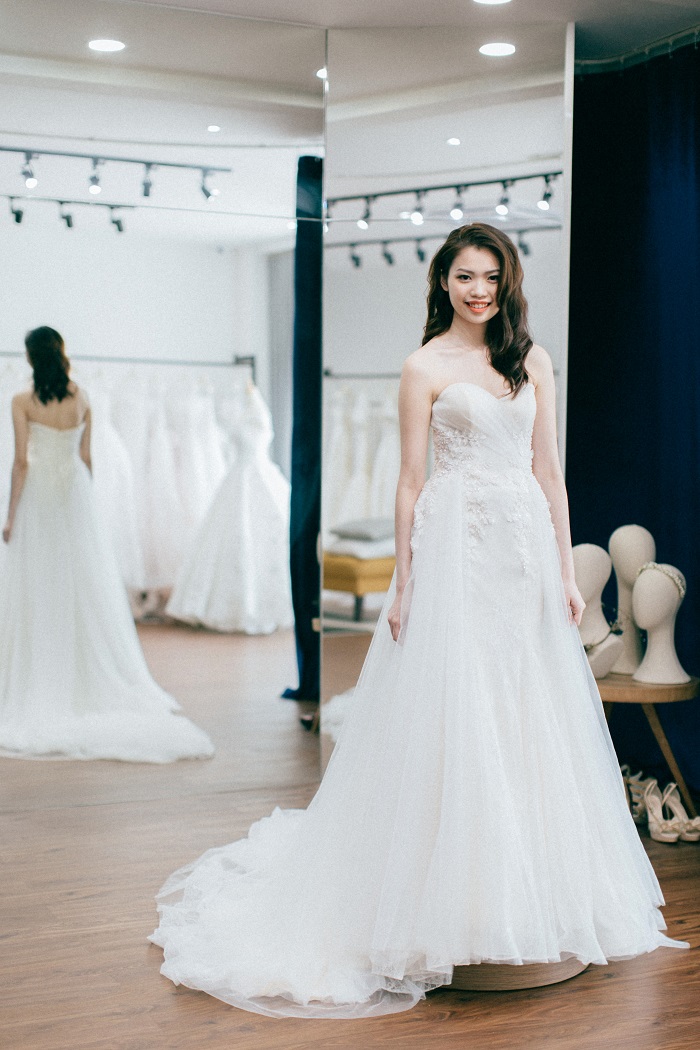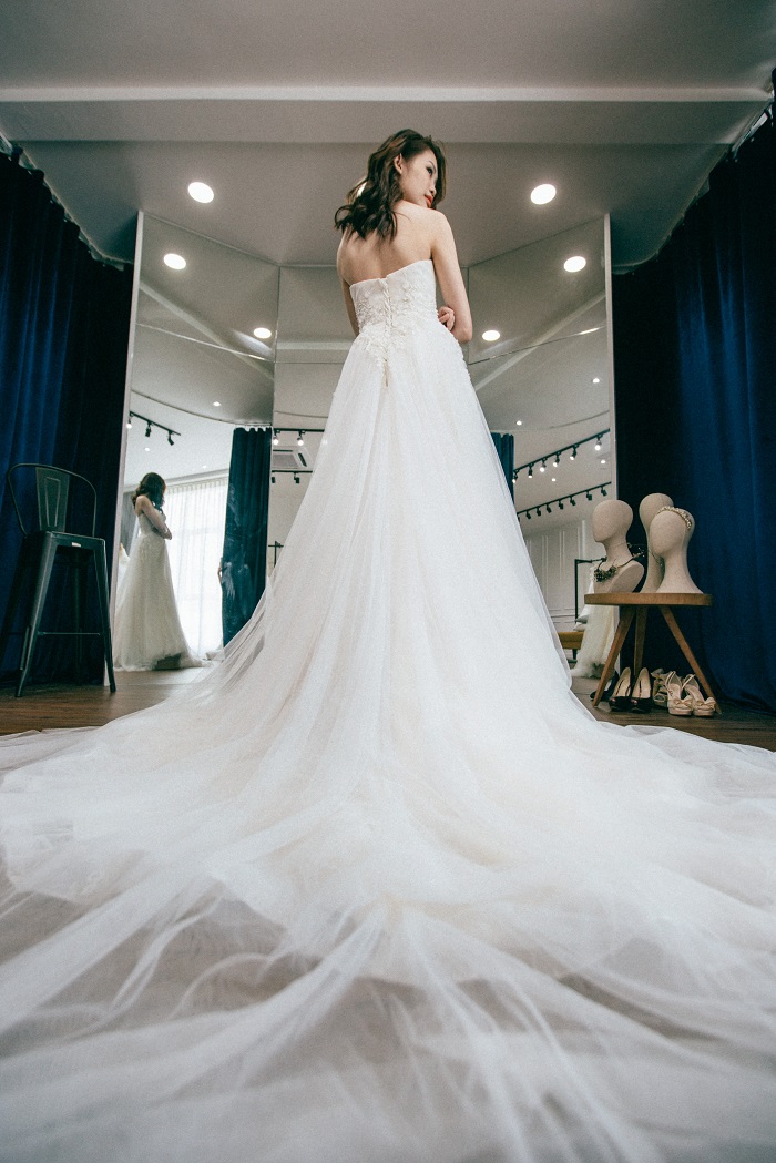 羞涩的待嫁新娘子在挑选和试穿婚纱的整个过程,会一直发生着微妙的变化,有忐忑、疑惑,也会意外、欣喜和满足。当新娘子穿上合体、舒服、衬托的婚纱的那一瞬间,身体会立即放松、神色坦然、她往镜子里瞥视自己的眼色是惊叹的;反之,则会流露出隐约的脆弱,身体会有短暂的僵硬。