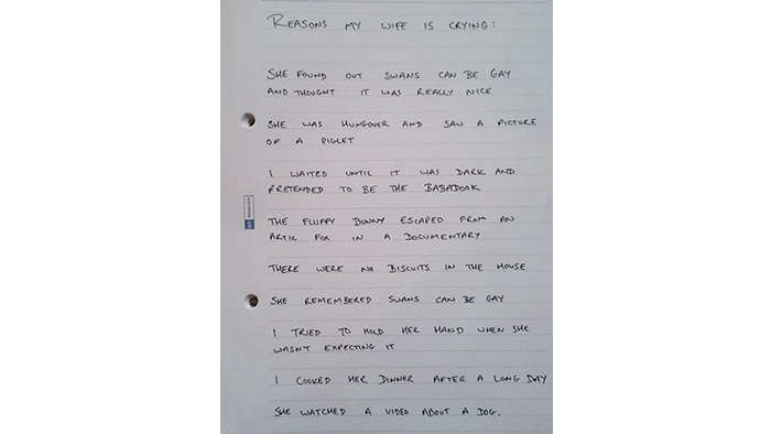 他用了一个月的时间来进行《Reasons My Wife Is Crying》这项任务,也在Twitter上发布了结果。这tweet 不但在短时间内获得了过万的转发,更另不少的网友大喊“有同感”! 来看看他的清单吧~