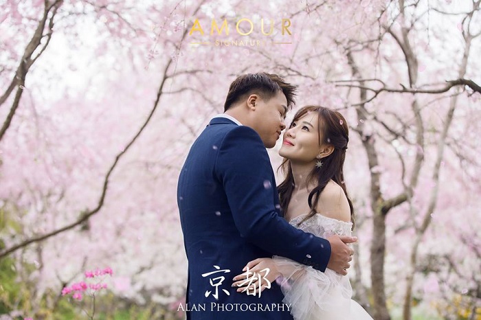 巧妙地运用大自然的美景衬托出新人的笑容,美得就像一幅画。