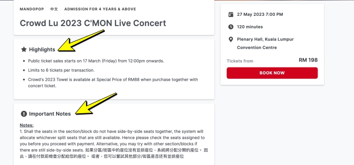 第四:事先读清楚主办单位放出的Highlights 和T&C,包括一人限买几张票、座位是否是系统分配等等
