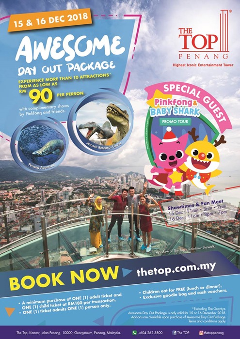 此外,在假期期间还有 Pinkfong & BABY SHARK 的活动哦! 风靡全球小孩的 Pinkfong & BABY SHARK,将于 12 月 15 及 16日 出现在这里,和全场小朋友一起唱唱跳跳。适逢学校假期,目前只需 RM90 起就能在 The Top Penang 玩得不亦乐乎,同时体验一种不同凡响的槟城之行!欲知更多详情,请浏览 thetop.com.my。