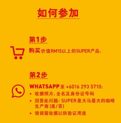 只需要购买任何一种SUPER®的产品 (除ESSENSO™以外),凭总额超过15令吉或以上的单张正式收据即可参加。参与的产品包括 SUPER® COFFEE, SUPER® CHARCOAL ROASTED WHITE COFFEE炭烧白咖啡,SUPER® POWER, SUPER® MILK TEA,SUPER® TEA INFUSIONS 和 SUPER® NUTREMILL® 谷类饮料。