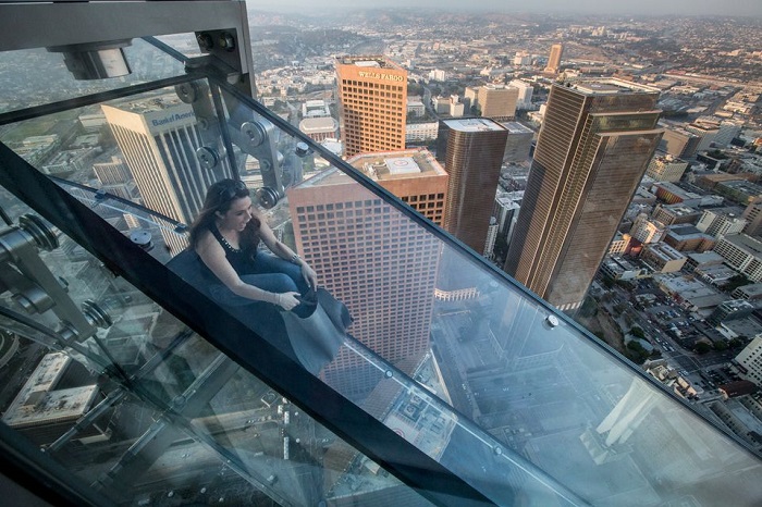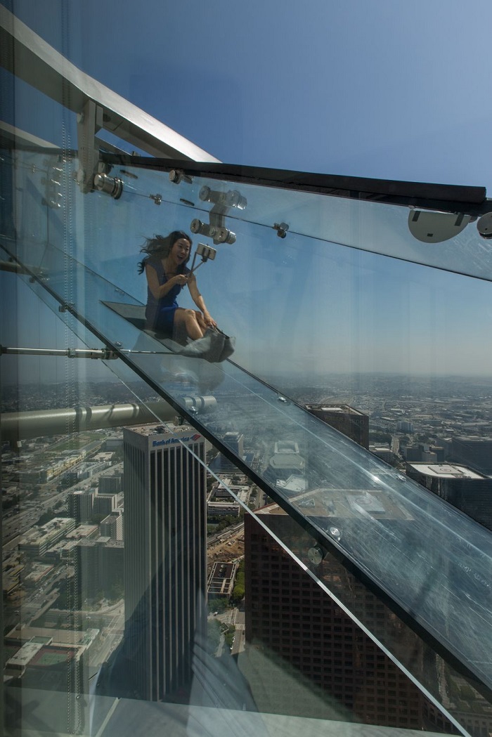喜欢挑战刺激活动的朋友,你有没有听过美国洛杉矶有一个玻璃滑梯呢?它就在美国加州洛杉矶市区的U.S Bank Tower内,位于大楼的第70层和69层窗外,全透明玻璃的设计,滑梯全长是13.7米,距离地面305米。我的天啊,单单要我站在69楼的玻璃上面我都已经双腿发软了。