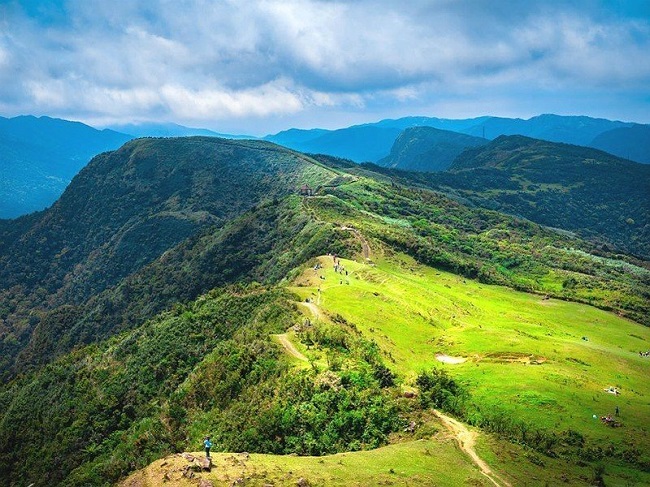 一路至野趣十足的广享草原, 这片海拔500公尺的青草坡,倾斜将近30度,迤逦延伸有四、五百公尺。坡面上的绿草,梗短且密实,像大自然用心编织的上等毛毯。天气晴朗时,草原上可西眺三貂岭,东望太平洋;变天时,腾云驾雾,甚至可做捉迷藏的游戏;秋冬之季,强劲的季风常推来一朵一朵的云团,漫山的五节芒在云团中若隐若现。