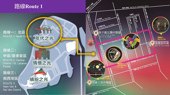 “年代之光”:串连飞喇士街休憩区、沙梨头北街筷子基北湾休憩区及逸园跑狗场。路线上多个地点被布置成星空。其中,观众可到飞喇士街休憩区欣赏“八大行星”及登上未来太空舱体验“星际漫游”,又可在逸园跑狗场欣赏满载澳门人不同年代记忆的光雕表演“逸缘忆记”;