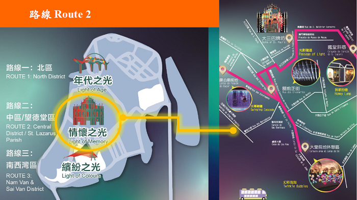 “情怀之光”: 串连大堂前地休憩区、大三巴牌坊、关前正街、康公庙前地及疯堂斜巷,其中,观众可到康公庙前地参与“水幕秋千”及“AR 魔法沙桌”游戏,而“我家的灯”于疯堂斜巷展示不同年代的家居照明工具,反映澳门人的生活变迁;