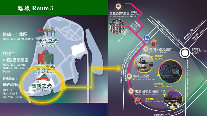 “缤纷之光” : 覆盖“南湾‧雅文湖畔”、南湾湖水上活动中心、南湾白帐篷和圣若瑟修院圣堂,带来水幕投影“惊艳四海”和大型灯饰装置“荷塘湾影”等,还有12 米高的巨型充气“麦麦” 在南湾‧雅文湖畔上“麦游澳门”,观众又可欣赏以灯饰装置结合钢琴表演的“流动旋律”,以及到“雅文市集”搜罗澳门特色小食及文创产品;