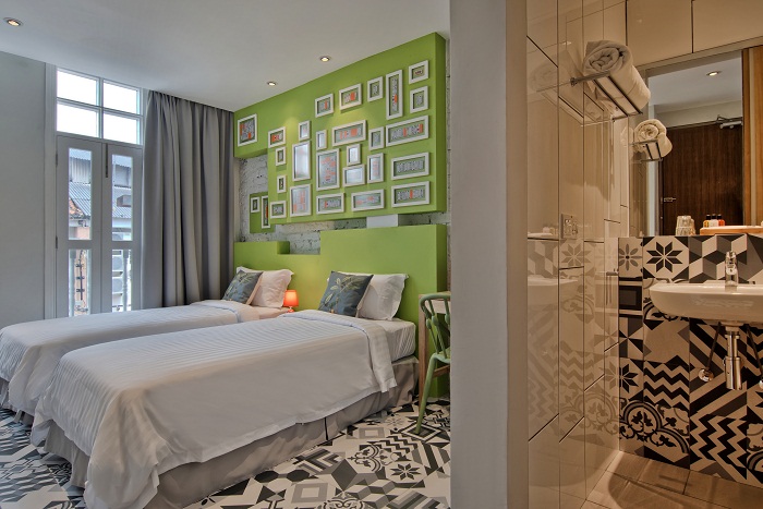 Timez酒店共有5大主题的房间,分别是Chinese、Peranakan、Portuguese、Dutch和British。我们这一次入住的房间是Peranakan主题的Cherki房间和Little Nyonya房间。房间虽小,五脏俱全。最让我喜欢的就是他们家的灯光,很明亮,厕所的采光也很好。Cherki房间以绿色为主墙色,南洋土生族群的牌九纸牌游戏卡是亮点,即使是马来西亚人也未必懂得的文化,没想到在酒店中也能懂得一些文化啊!另一间则是Little Nyonya房间,双人床,木质家具的设计,把nyonya融入现代的房间设计中。地砖是我们常看到的红色瓷砖,让人多一份归属感。