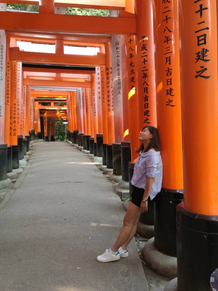 首先,我必须建议所有女生,别因为爱美而穿高跟鞋和裙子,你会很想死!朋友们每次到京都都一定会打卡的地方,到现场时真的会被其壮观场面所镇住。如此让人惊讶的艳红隧道,上千个红色鸟居排成隧道,一个个连接上稻荷山,这么不可思议的场景,难怪电影【艺妓回忆录】、【名侦探柯南电影】会把它列入拍摄场景呢!从入口处爬到山顶,我们总共花了大概一个小时多的时间,挺累人的,不过,走到上面,你会发现,一切都是值得。