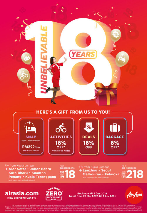 周年庆优惠将于2019年11月25日 (0001h GMT +8) 至2019年12月1日 (2400 GMT +8) 在airasia.com及亚航手机应用程序开放订购,出发日期为2020年4月27日至2021年3月1日。