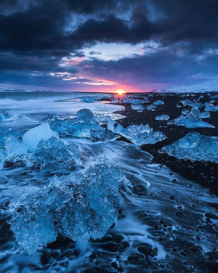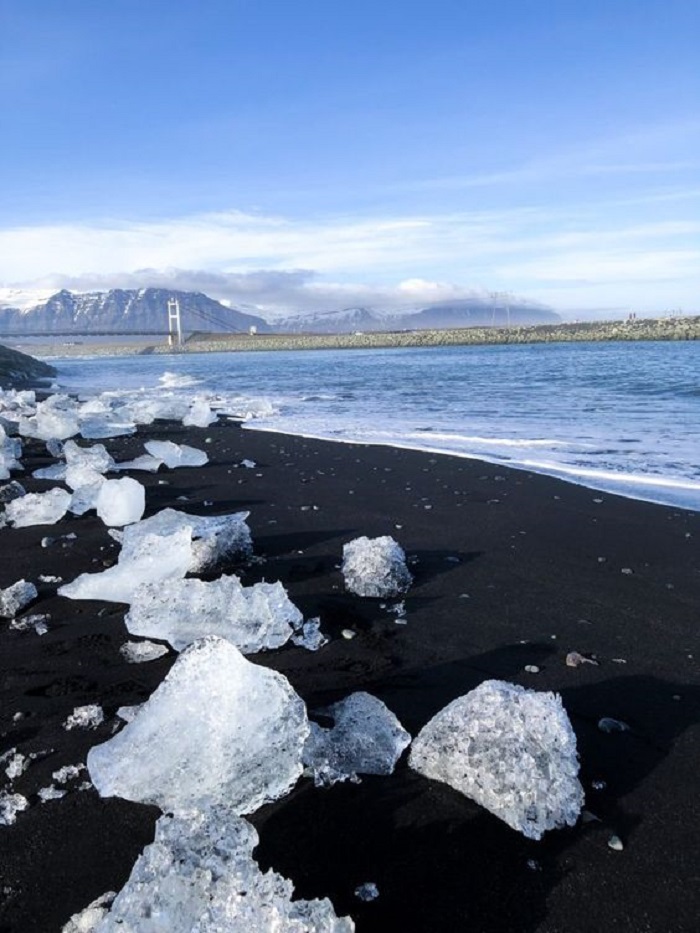 钻石冰沙滩位于冰岛南岸的杰古沙龙冰河湖旁,是一片遍布碎冰的绝美黑沙滩,属于Breiðamerkursandur冰川平原的一部分。透明的冰块和黝黑的沙滩形成了鲜明的对比,特别是在阳光明媚的日子里,冰块反射着太阳光芒,犹如钻石般闪耀,因此得名钻石冰沙滩。