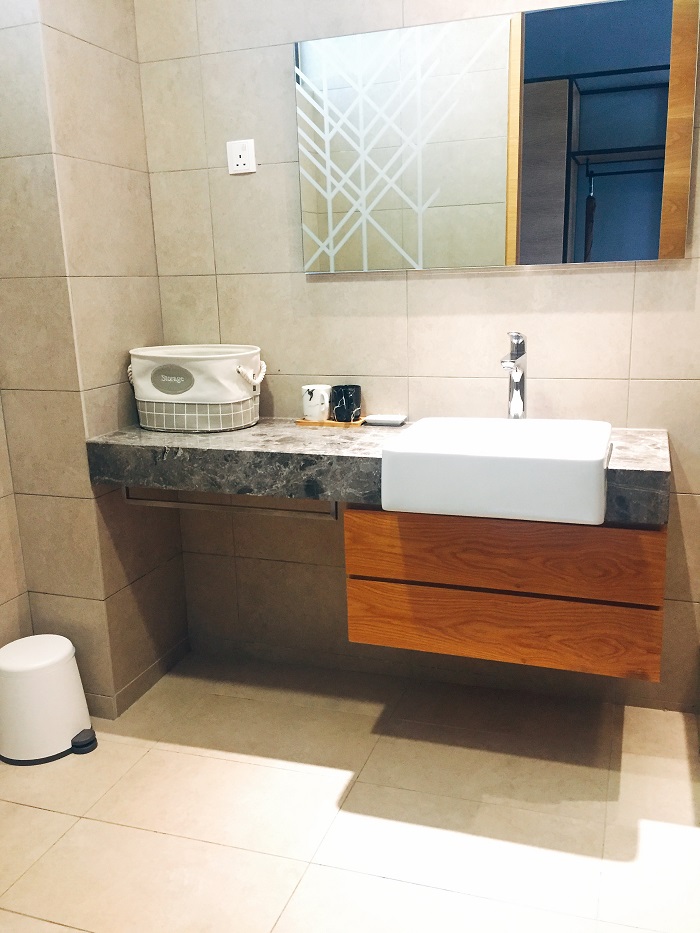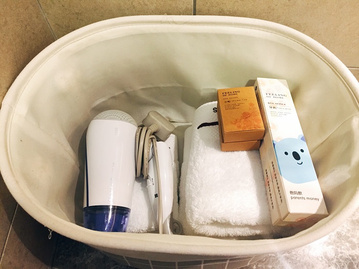 浴室是我每次入住酒店或民宿最大的考量重点。这个浴室,我爱!虽然没有浴缸,但是大理石纹路的化妆台,任女生都会喜欢哦!还有文青的大理石杯,刷牙这件事情突然变得好开心哦!梳妆台上摆放着一个收纳袋,里头装着面巾、牙具、浴帽等,都是很可爱的包装。