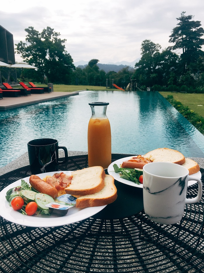 把闹钟关掉,睡到自然醒的感觉,真的很棒。迎接美好早晨的是鸟鸣声,把窗口打开就是泳池,很疗愈的早上。于是,我们把早餐端到泳池边享用。晨曦的阳光不刺肉,反而温暖。想到快要离开这个美好的地方,还真是舍不得啊!